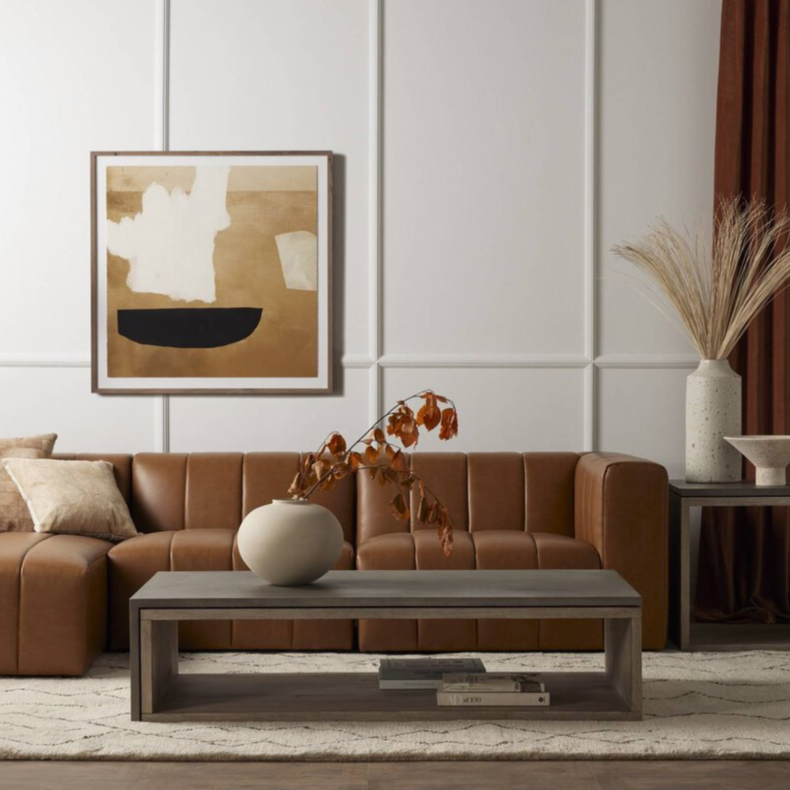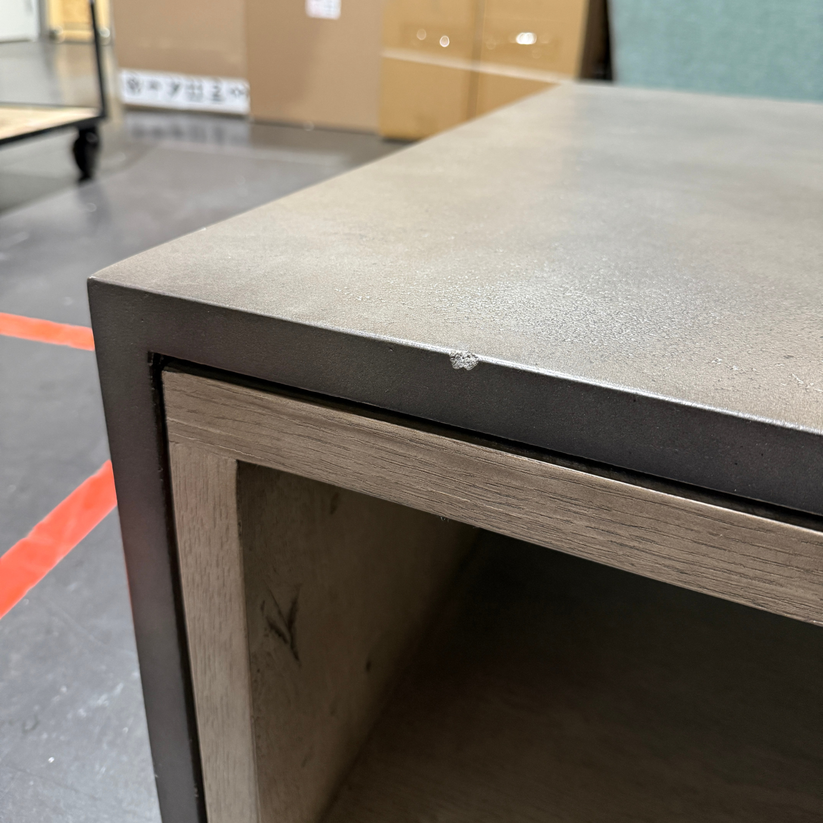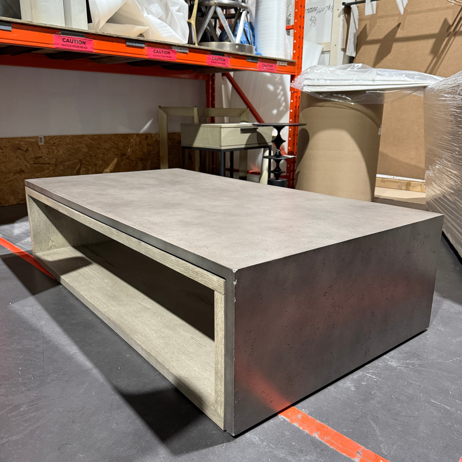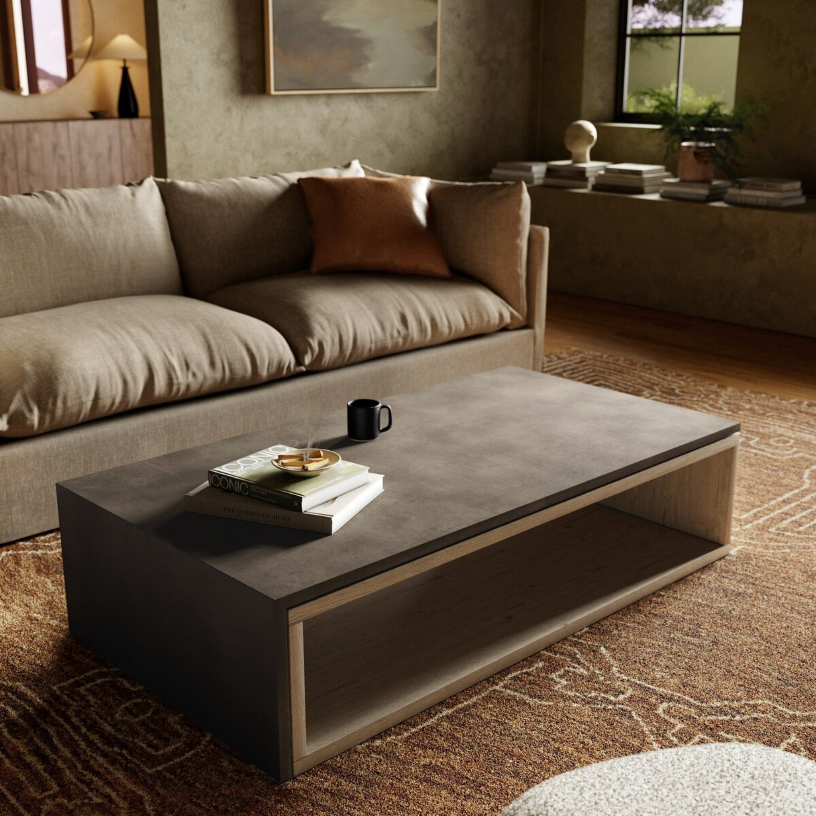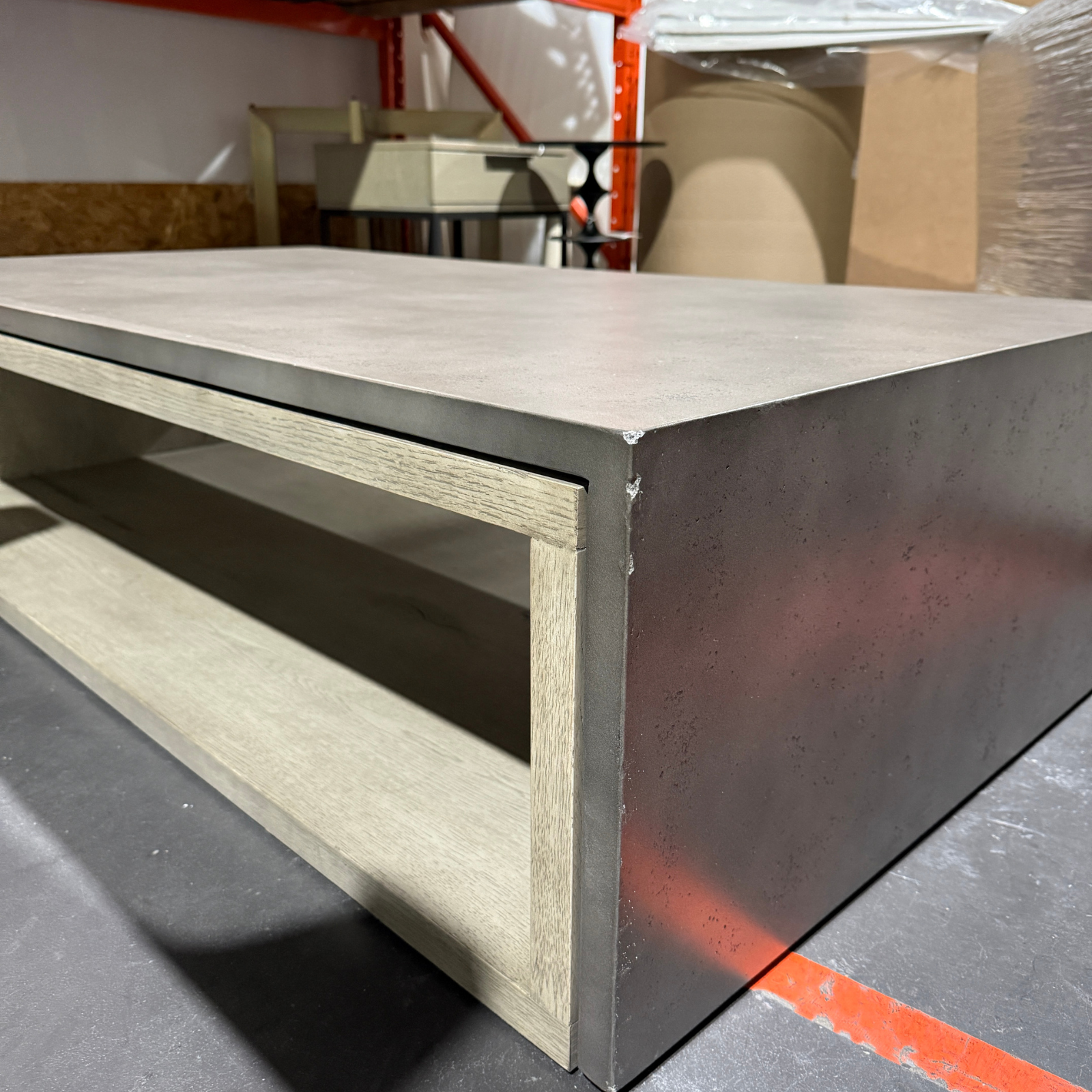 DESCRIPTION: Thick-cut oak veneer forms a clean, structured frame for a fold-over concrete top finished in a deep, dark grey. Whether styled with stacked books or kept clear, this modern-minded coffee table awes from all angles.