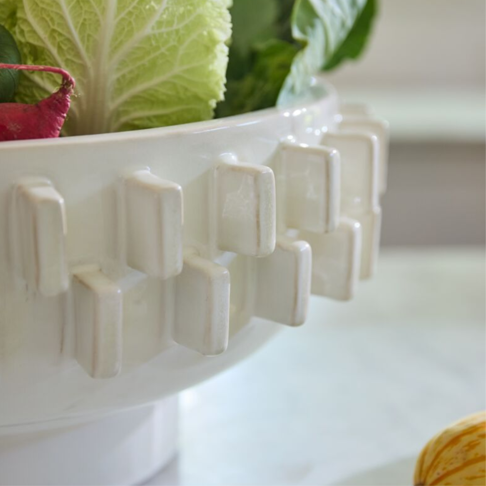 DESCRIPTION: Add artful versatility & sculptural design to home decor with the extra-large, food-safe ceramic Rhys Bowl. The curved bowl sits on a low clean foot & is finished in a white reactive glaze that has hints of warm tones. Two rows of dimensional, rectangular tabs are hand applied around the top band. This statement accent piece or functional serving bowl offers an artisanal quality whether filled with food, a plant, or decorative objects.
