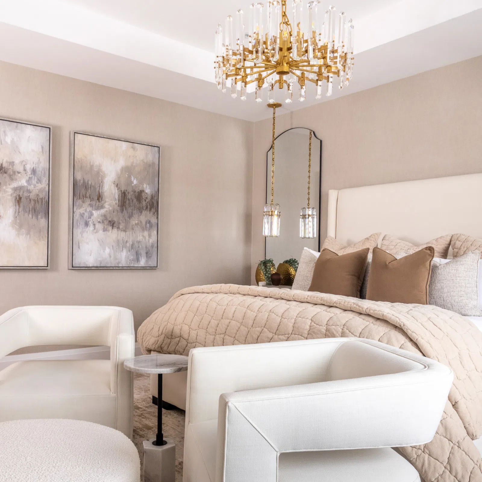 DESCRIPTION: A modern abstract painting in soft beiges, greys, and golds, with fluid brushstrokes that balance elegance and spontaneity — ideal for contemporary interiors.