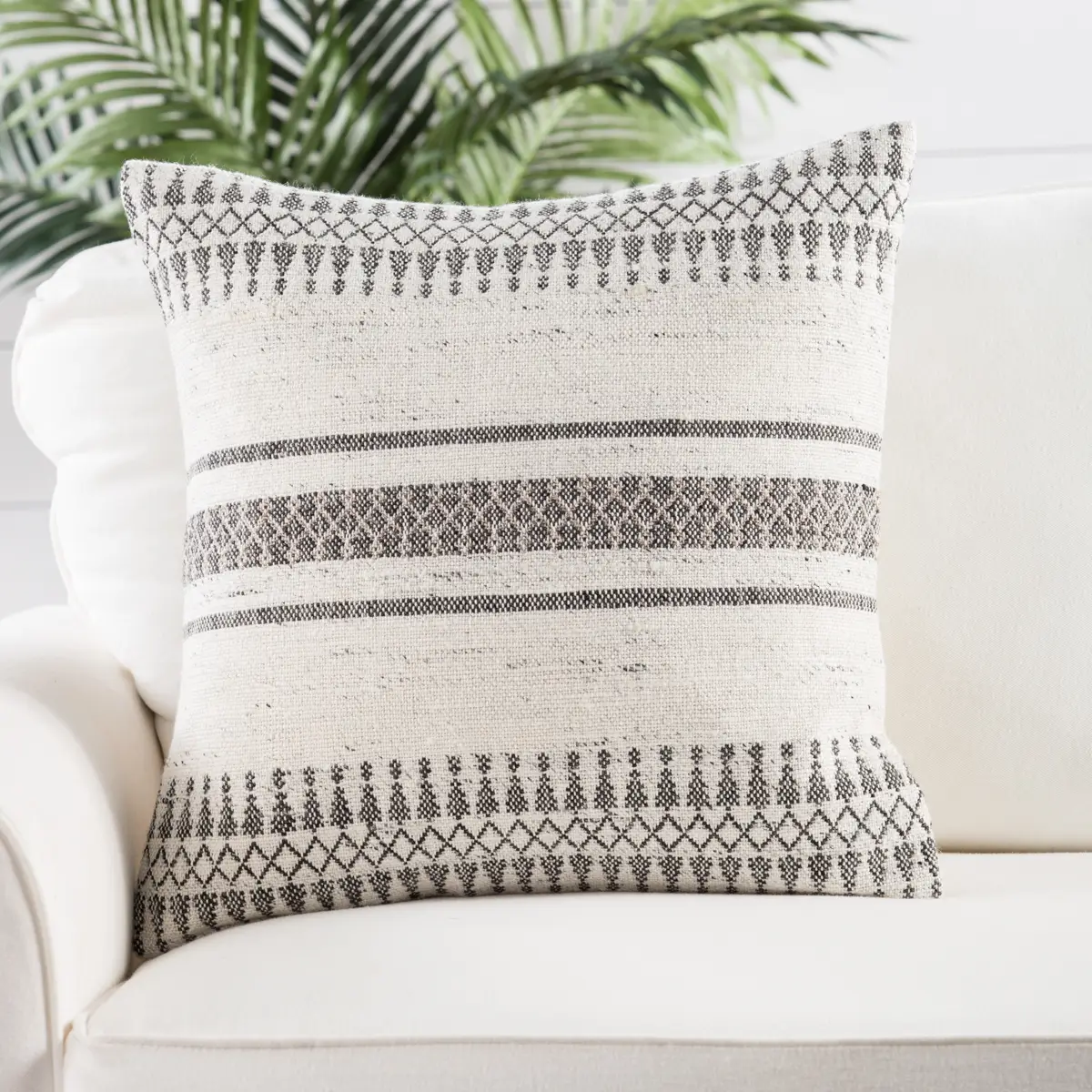 Description: Traditional motifs inspired by European folk patterns lend global style to this stunning throw pillow. Soft in a viscose and wool construction, this square cushion showcases an intricate diamond and lattice border design in black, tan, and ivory.
